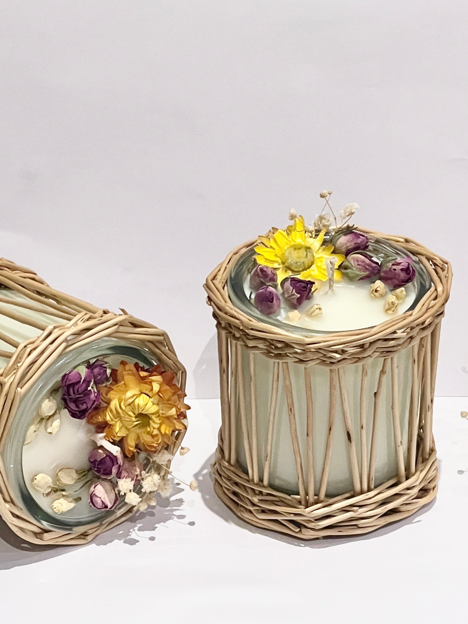 Habillée d’un support en osier tressé, cette bougie en cire de soja végétale est délicatement ornée d’un quatuor de fleurs séchées : roses délicates, jasmin pur, immortelles solaires et la touche aérienne du gypsophile.