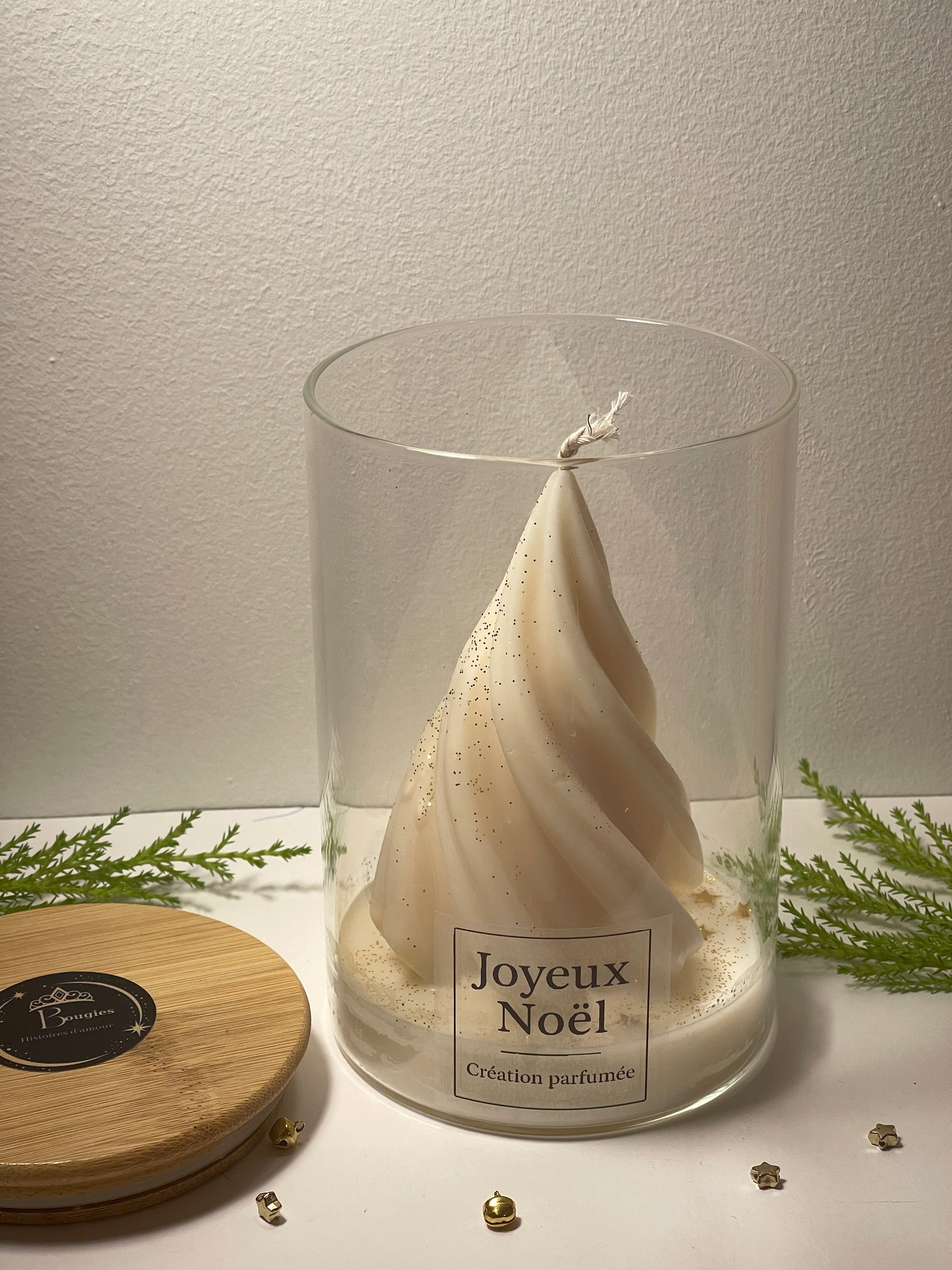 Présentée dans un pot en verre transparent (15 cm de hauteur × 10 cm de largeur) avec couvercle en bois naturel et une étiquette festive « Joyeux Noël – Création parfumée ».