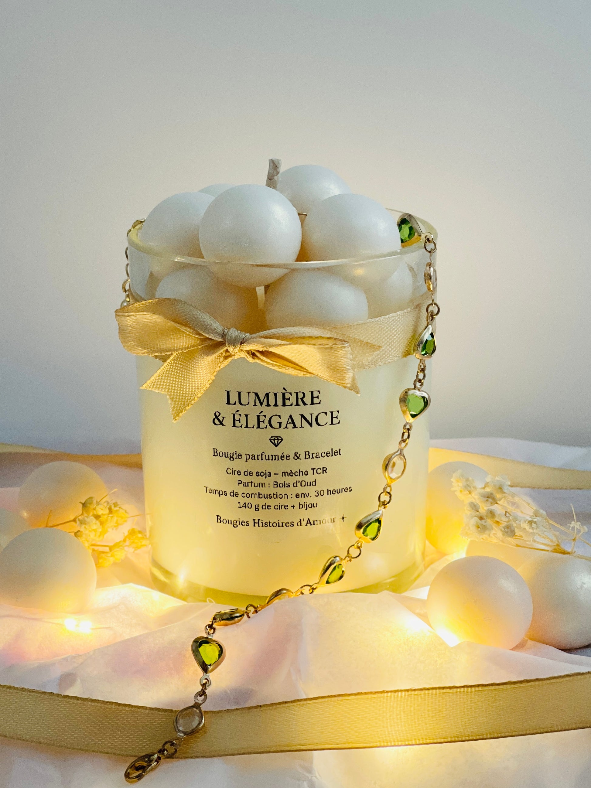 Bougie parfumée élégante – Perles nacrées & Bracelet surprise